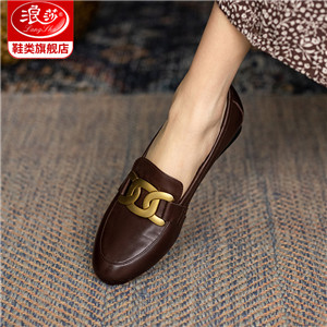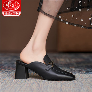 浪莎粗跟單鞋女2021早春女鞋一腳蹬小皮鞋中跟方頭深口真皮樂福鞋