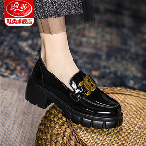 浪莎馬銜扣樂福鞋女英倫2021黑色真皮粗跟松糕一腳蹬厚底中跟單鞋